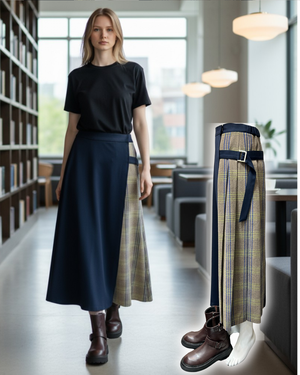 スカートも、チェック柄と無地を組み合わせてラップスタイルに仕上げた “ トラッド感の中にも女らしさを求めた ” 素敵なデザインですね!・・・