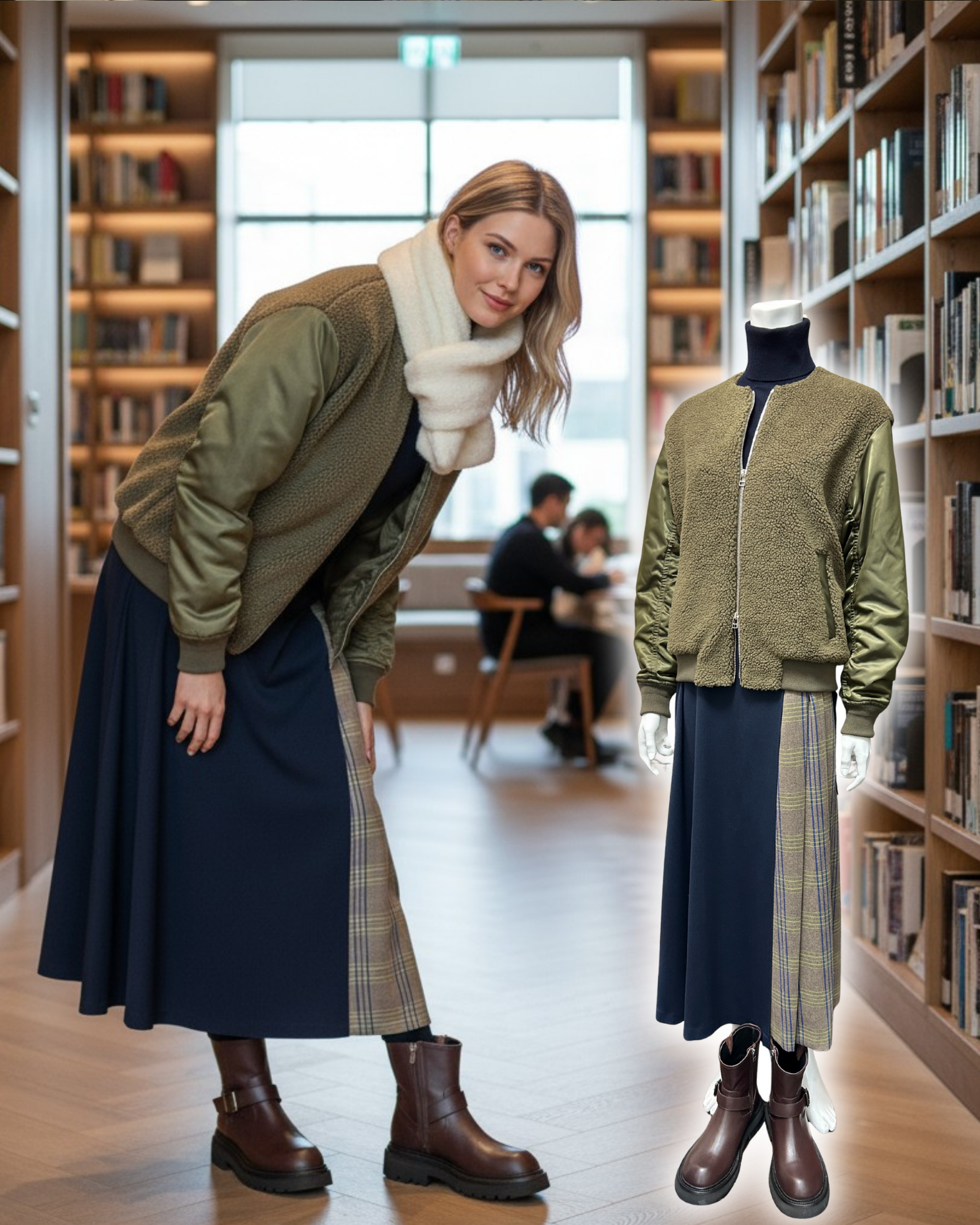 今回から、バーチャルモデルさんを採用しました!シープボアブルゾンも、シープボアストールも、インナーニットも、ラップスカートも、MANAブーツまで・・イノウエの店内で撮影したトータルスタイリングですよ!